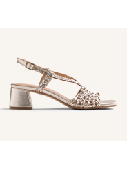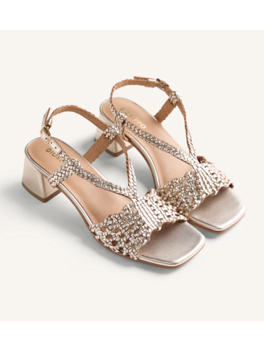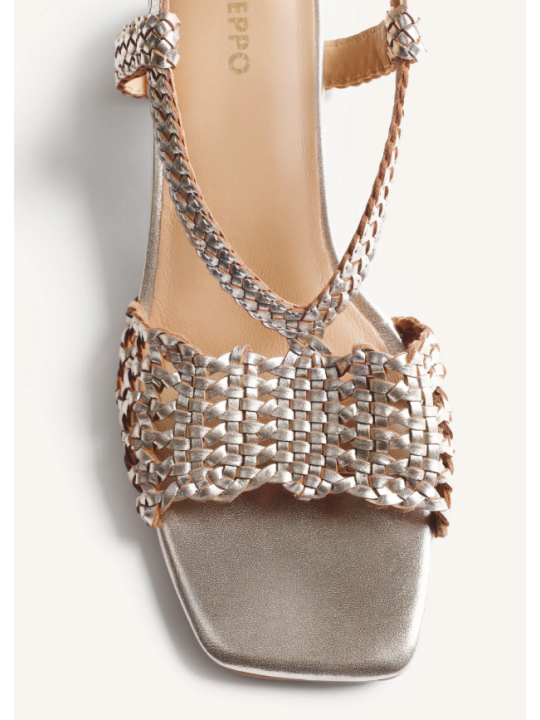 Sandalia de tacón bloque bajo y punta cuadrada. El diseño destaca por un acabado trenzado artesanal en la pala y las tiras que sujetan el empeine, complementado con una pulsera ajustable al tobillo mediante hebilla.
