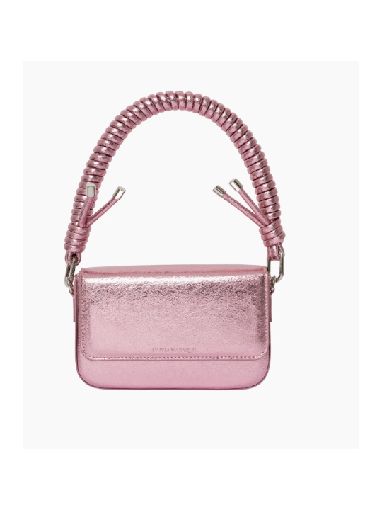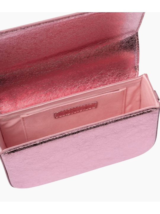 Bolso pequeño con diseño rígido, confeccionado en piel vegana con acabado metalizado y detalles plateados. Dispone de cierre de solapa con imanes interiores, bolsillo interno y logo grabado en el exterior. Su tamaño compacto y correa ajustable permiten llevarlo cruzado o al hombro con total comodidad.