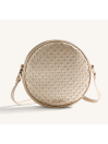 Bolso de formato circular con diseño trenzado y pequeños detalles metálicos que aportan textura y sofisticación. Cuenta con cierre de cremallera y correa ajustable para llevarlo cómodamente al hombro o cruzado.