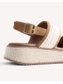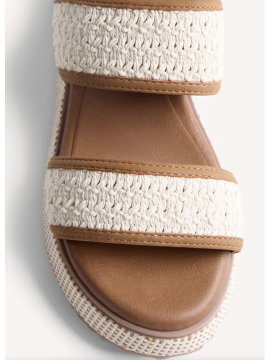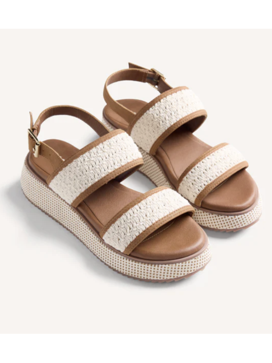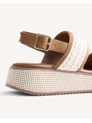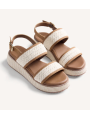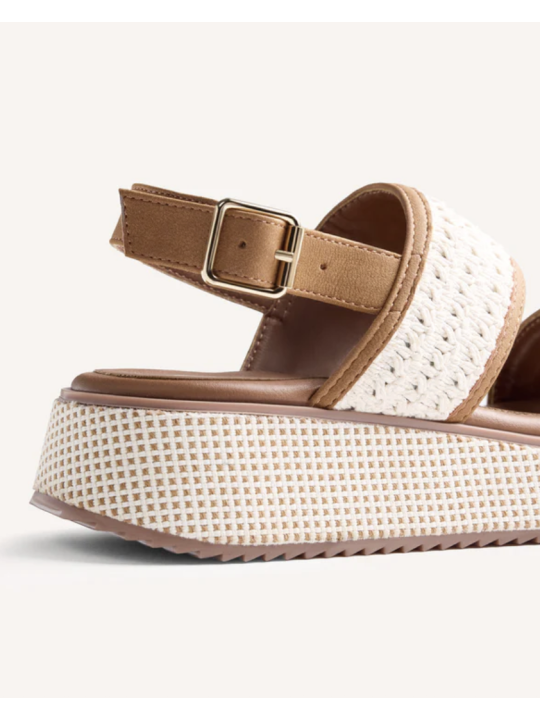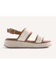 Sandalia con diseño de tiras anchas y cierre ajustable en el tobillo. Combina acabado trenzado con detalles lisos y cuenta con plataforma ligera que aporta estabilidad y confort en cada paso.