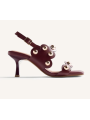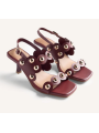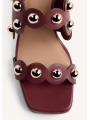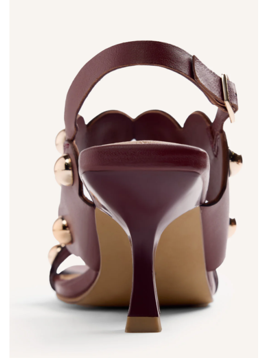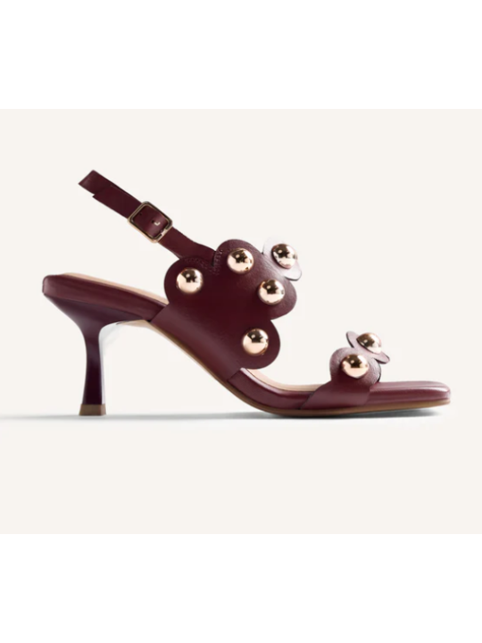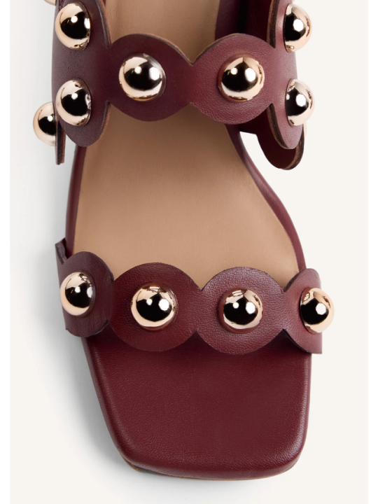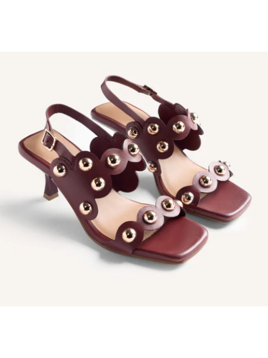 Zapatos de tacón con punta cuadrada moderna. Presentan tiras decoradas con un borde festoneado distintivo y adornadas con grandes tachuelas metálicas esféricas. Incluyen una fina tira de sujeción en el talón con una pequeña hebilla ajustable para un ajuste seguro.