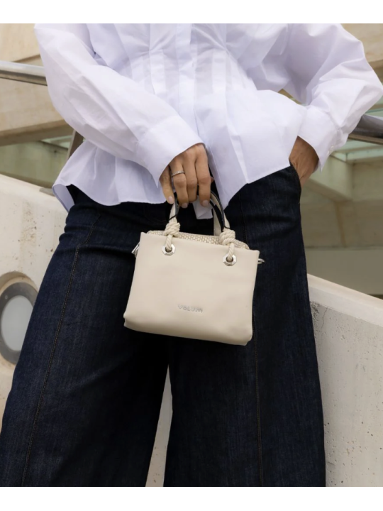 Bolso de tamaño compacto con diseño estructurado y líneas limpias. Presenta asas cortas con detalle trenzado que aportan un toque artesanal y distintivo, además de un formato práctico ideal para llevar lo esencial. Su silueta elegante lo convierte en un complemento versátil para cualquier ocasión.