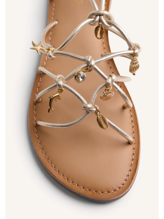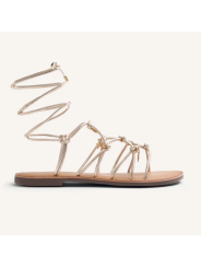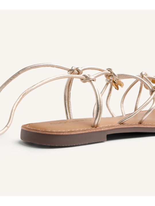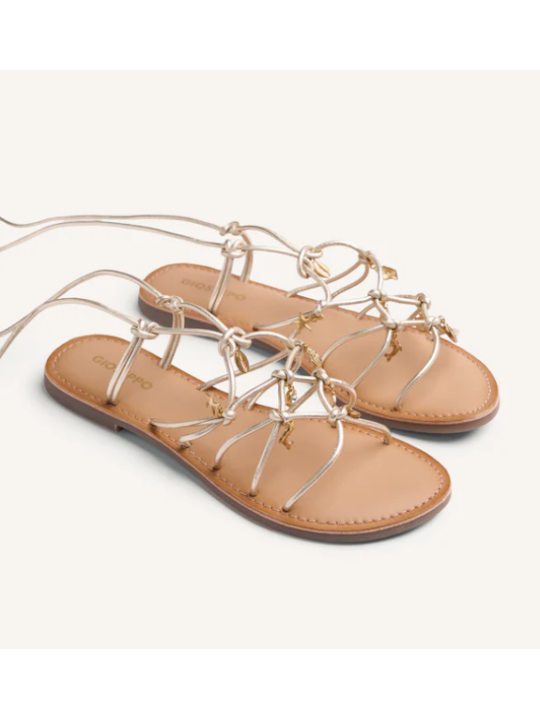 Sandalia plana de inspiración romana y estilo sofisticado de Gioseppo. Diseñada con finas tiras entrelazadas que envuelven el pie y detalles de nudos decorativos, incorpora pequeños adornos metálicos que aportan un acabado elegante y diferenciador.
