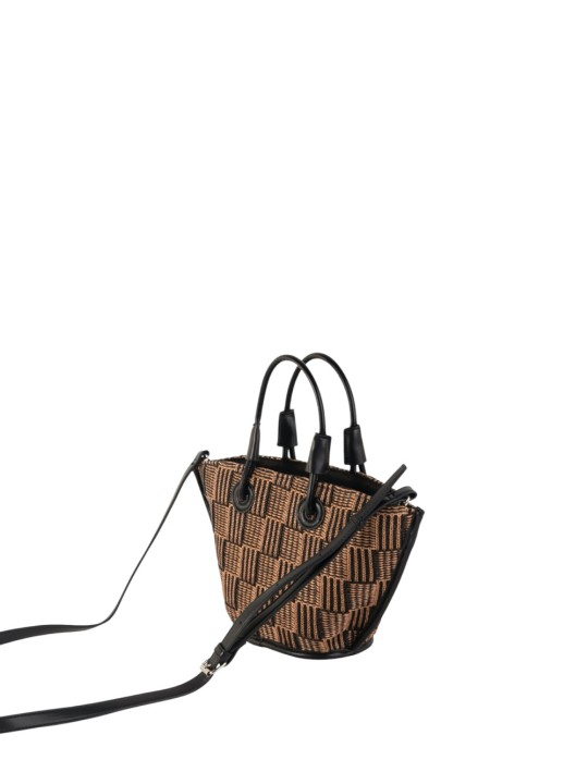 Bolso tipo tote en formato compacto con diseño trenzado en patrón geométrico que aporta un estilo moderno y cuidado. Cuenta con asas cortas y correa adicional para llevarlo al hombro o cruzado, ofreciendo versatilidad en su uso. Su tamaño reducido lo hace ideal para llevar lo esencial con comodidad.